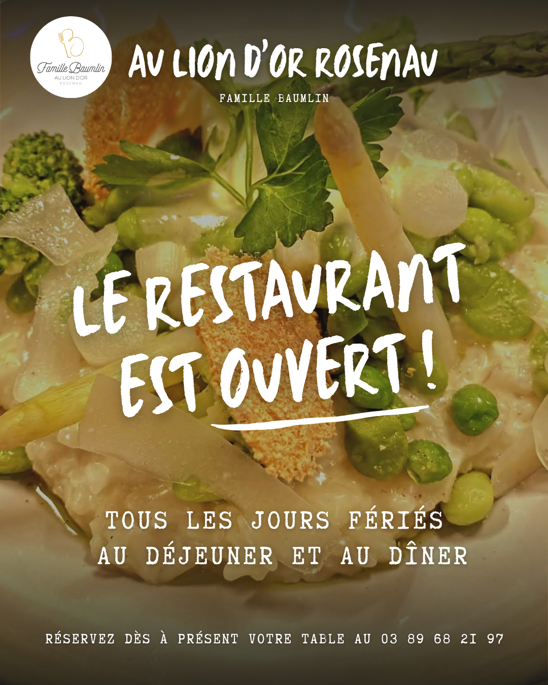 uniquement sur réservation au 03 89 68 21 97 ou https://www.auliondor-rosenau.com/reserver-restaurant-rosenau/